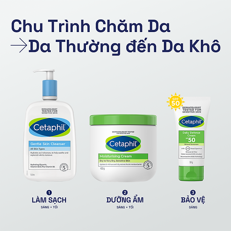 Combo 3 Bước Cetaphil Chăm Da Dịu Lành: Sữa rửa mặt 500ML + Kem dưỡng ẩm 50G + Gel chống nắng SPF50+