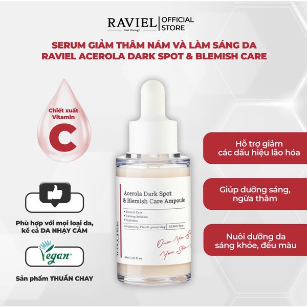 Tinh chất dưỡng trắng mờ thâm nám và tái tạo da Raviel Acerola Dark Spot Blemish Care Ampoule 30ml